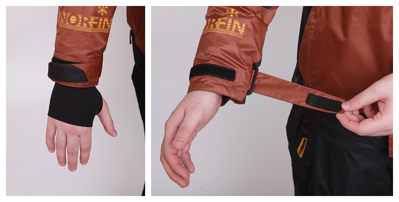 Нижняя часть рукавов снабжена регулировкой объема с застежками Velcro. Эластичные манжеты имеют отверстие под большой палец.