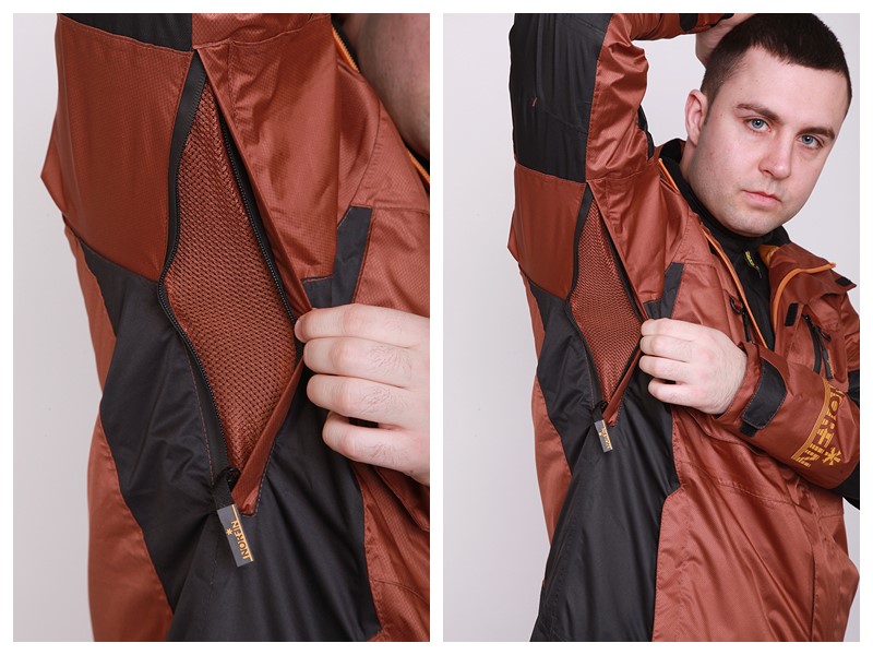 При интенсивной физической нагрузке, а также в теплую погоду, можно воспользоваться дополнительными клапанами вентиляции. Они расположены под рукавами и открываются с помощью застежек-молний.